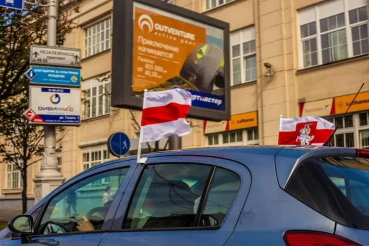 Другой автомобиль с бело-красно-белыми флагами в Минске. Фото сделано в июне.