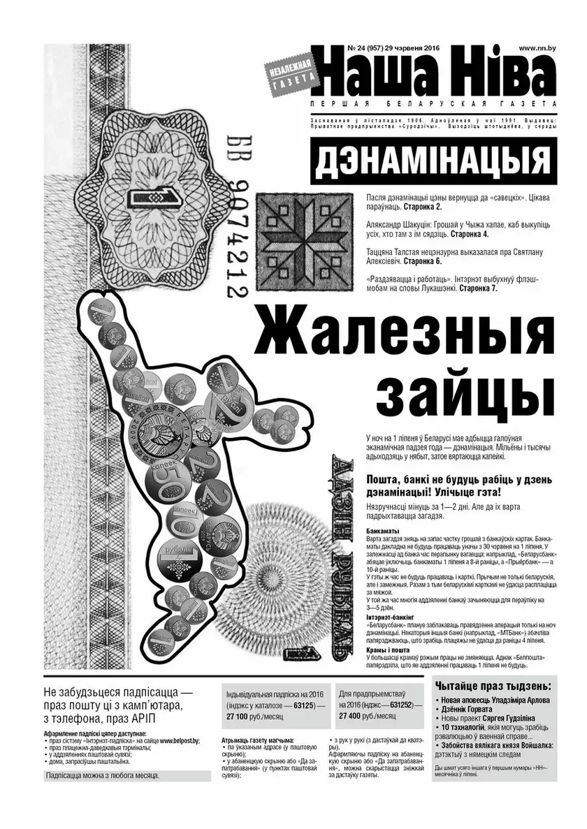 Помните, что Наша Нива/NN.BY — независимая газета. Она существует на пожертвования и средства от продаж. Поэтому она отражает интересы белорусского общества, а не властей. Наша Нива была основана в 1906 г., возрождена в 1991 г. Пожертвовать средства для НН можно в любом банке, а такжечерез ЕРИП. Спасибо за поддержку!