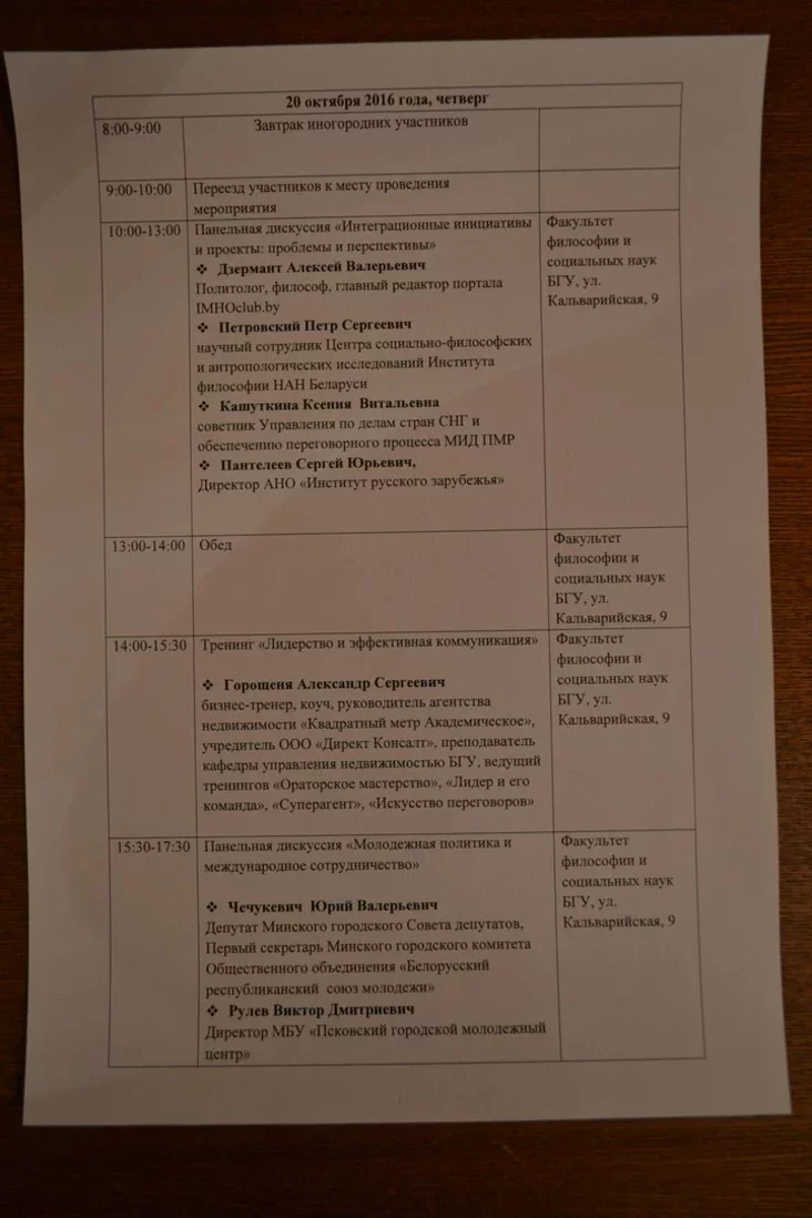Горощеня выступил с тренингом «Лидерство и эффективная коммуникация». В программке мероприятия его представили как «преподавателя БГУ». Причем тренинг проходил на базе факультета философии и социальных наук БГУ, который возглавляет Вадим Гигин.