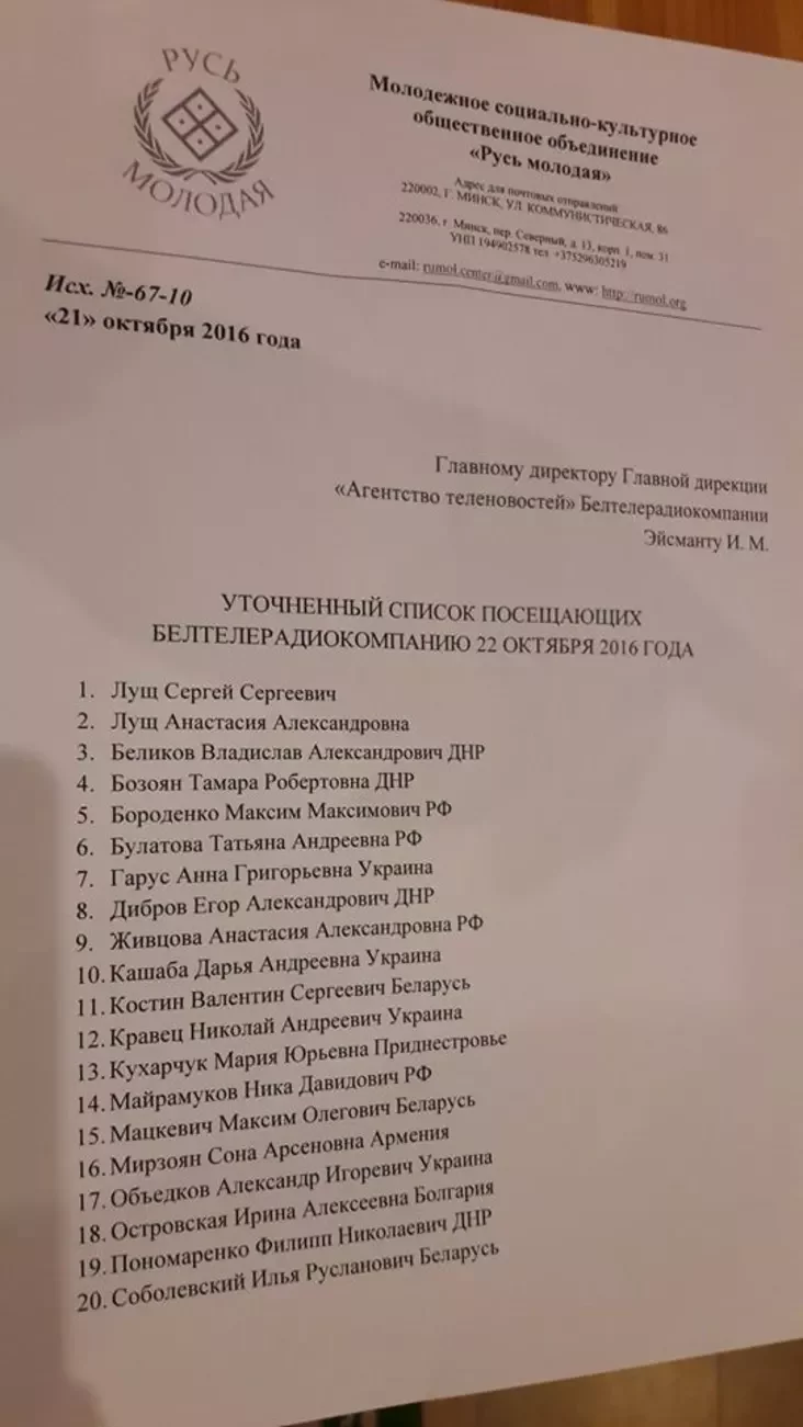 22 октября участники форума посещали Белтелерадиокомпанию. На своих страницах в социальных сетях представители форума выложили список участников, которые должны были прийти на БТ.