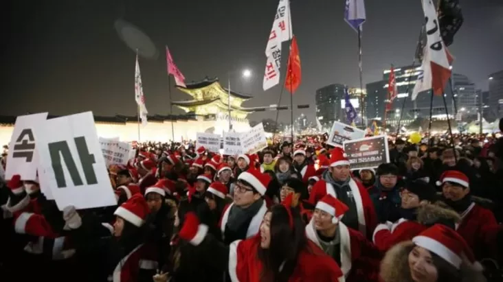 В девятую субботу многотысячных протестов в Сеуле с требованием отставки южнокорейского президента Пак Кын Хе манифестанты массово нарядились в костюмы Санта-Клауса.