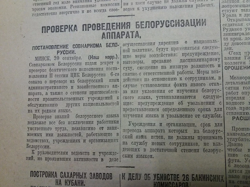 Нужно знать специфику 1920-х годов — советский официоз жил во многом идеей мировой революции, поэтому на первой странице «Правды» такие локальные новости, как «создание белорусского языка», и не могли появиться. На протяжении всего года на титульной странице главной партийной газеты обязательно присутствовала очередная информация о всеобщей забастовке британских шахтеров, появлялись сообщения о перевороте Пилсудского и о антипольском договоре СССР с Литовской республикой.