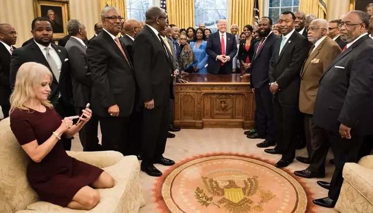 В понедельник, 27 февраля, Дональд Трамп встречался в Овальном кабинете с представителями университетов, в которых традиционно учились и преподавали афроамериканцы. В какой-то момент Келлиэнн Конуэй (советница Трампа, она в основном отвечает за коммуникацию и часто выступает от имени президента) решила сделать общую фотографию присутствующих в помещении на телефон — и для этого забралась с ногами на диван, а потом, не меняя позы, стала что-то делать в телефоне. В это время ее сфотографировал Брендан Смяловски из агентства AFP.