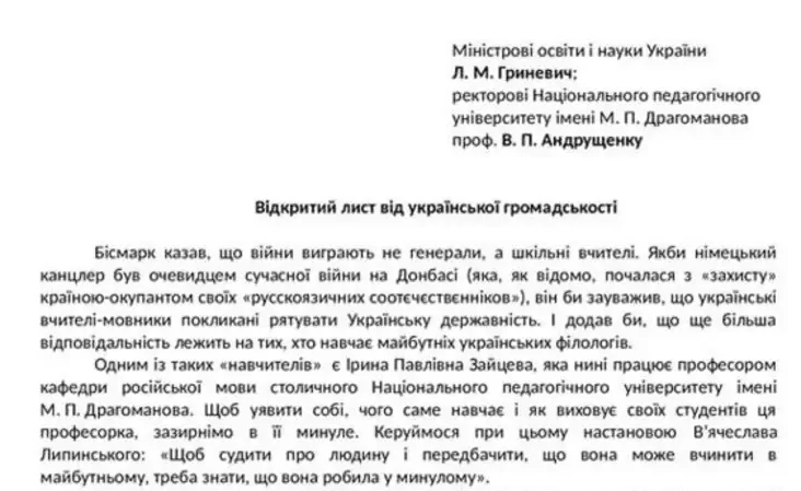 Карьера Зайцевой в Украине завершилась предсказуемо. Около 200 представителей украинской интеллигенции написали открытое письмо ректору Киевского педагогического университета и министру образования с просьбой уволить «агрессивную украинофобку и коррупционершу» из университета, где Зайцева занимала должность преподавателя.