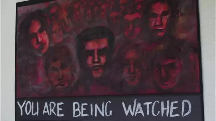 Главный герой читает плакат, на котором на самом деле написано «You arenot alone». Оруэлловская ассоциация, кажется, не случайна: его имя упоминается в сериале.