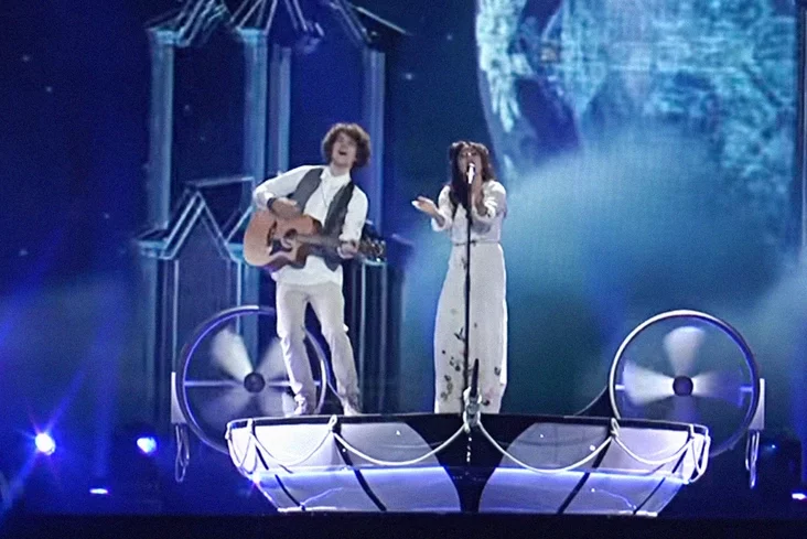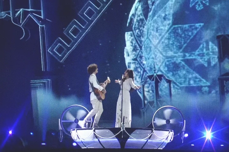 Во-вторых, это оформление сцены во время выступления белорусского дуэта. Ксюша и Артем стоят на чем-то похожем на лодку, а сзади идет видеоряд — на фоне Луны на экране всплывают деревья, звезды, архитектура с элементами орнамента.