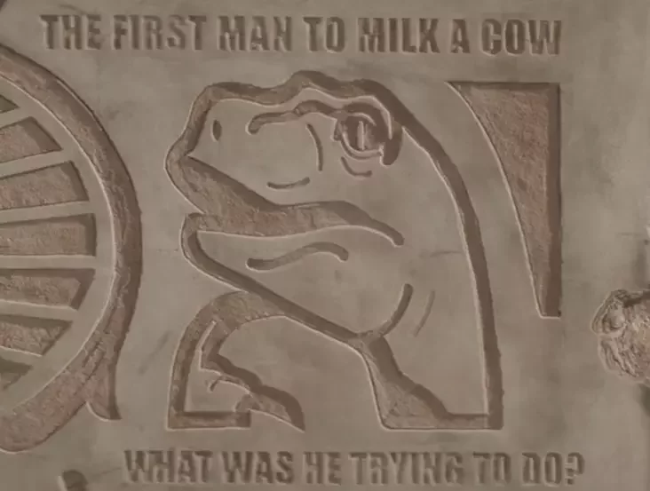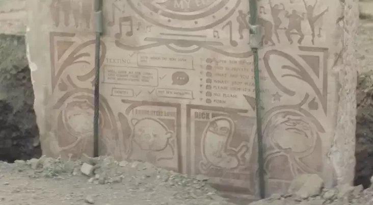 Что именно высечь на плите, решали пользователи 9GAG с помощью голосования. На плиту попали персонаж DickButt, «задумчивый динозавр» филосораптор и стоп-кадр из клипа Pen-Pineapple-Apple-Pen японского музыканта Пико-Таро.