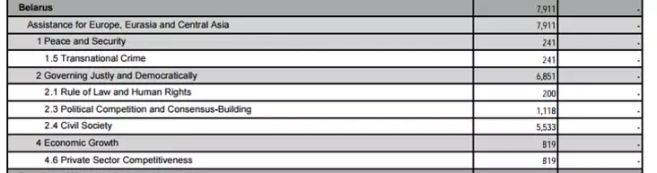 Из них 6,8 млн пошли по статье «Справедливое и демократическое госуправление», включая 200 тысяч долларов на «Верховенство права и права человека», 1,1 млн — на «Политическую конкуренцию и построение общественного консенсуса», 5,5 млн — на гражданское общество. Более 800 тысяч долларов в прошлом году выделялось по позиции «Конкурентоспособность частного сектора», а 240 тысяч — на борьбу с трансграничной преступностью.