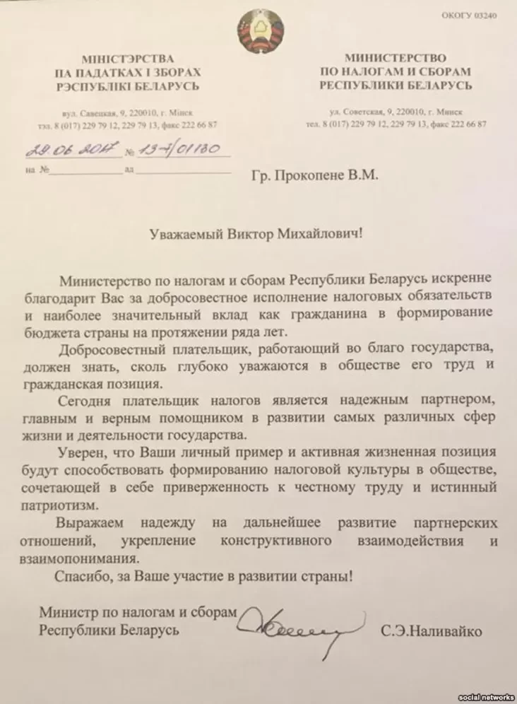 Бизнесмен Виктор Прокопеня на своей странице в фейсбуке опубликовал письмо с благодарностью от Министерства по налогам и сборам.