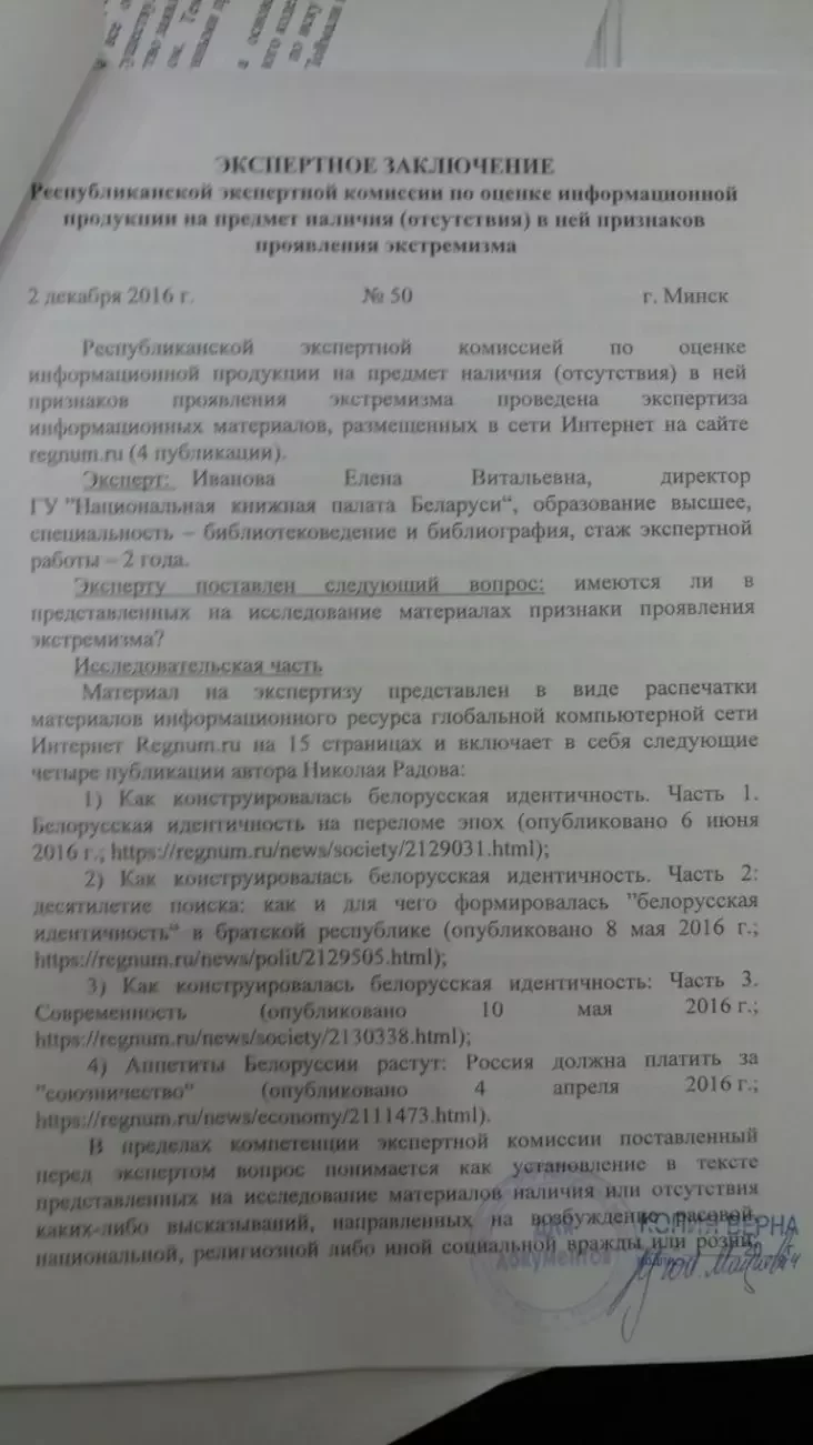 Тексты Павловца, которые он писал на сайте regnum.ru под псевдонимом «Николай Радов», для Мининформа анализировала Елена Иванова, директор Национальной книжной палаты Беларуси.