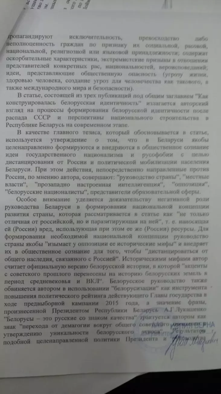 Любопытно, что в тексте экспертизы, которую СК прислал по запросу судьи (по гражданскому делу Павловца против «Советской Белоруссии»), всего 5 листов. Хотя очевидно, что после четвертого листа текст обрывается, и сразу следует последний лист с выводом о том, что в статьях Павловца есть признаки экстремизма. В том, что одна или несколько страниц отсутствуют, вы можете убедиться сами. Родственники обвиняемого отмечают, что это все, что пришло в суд.