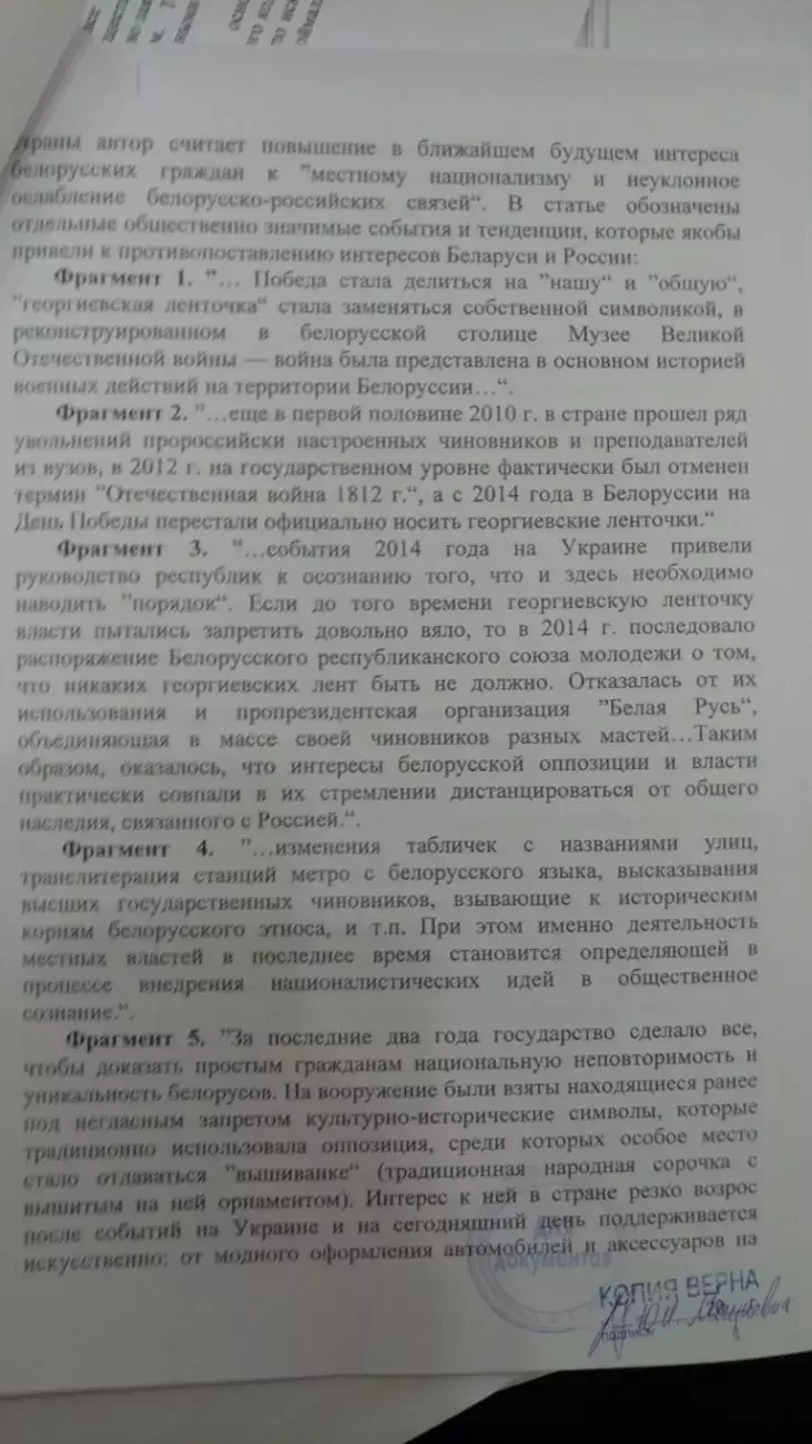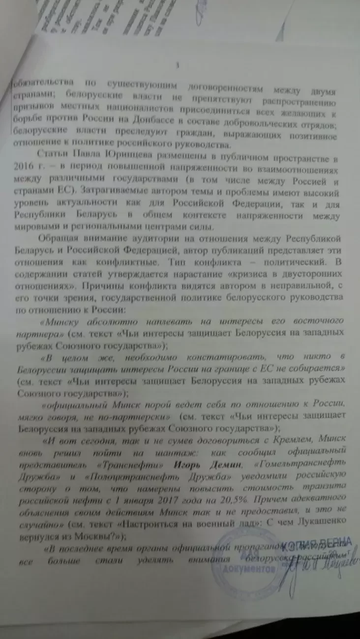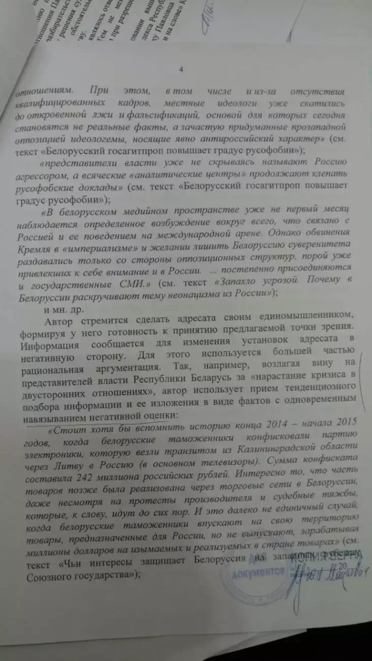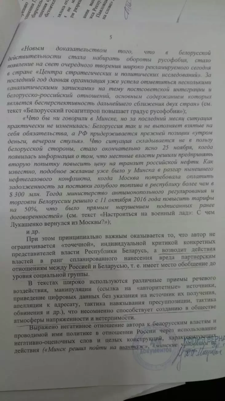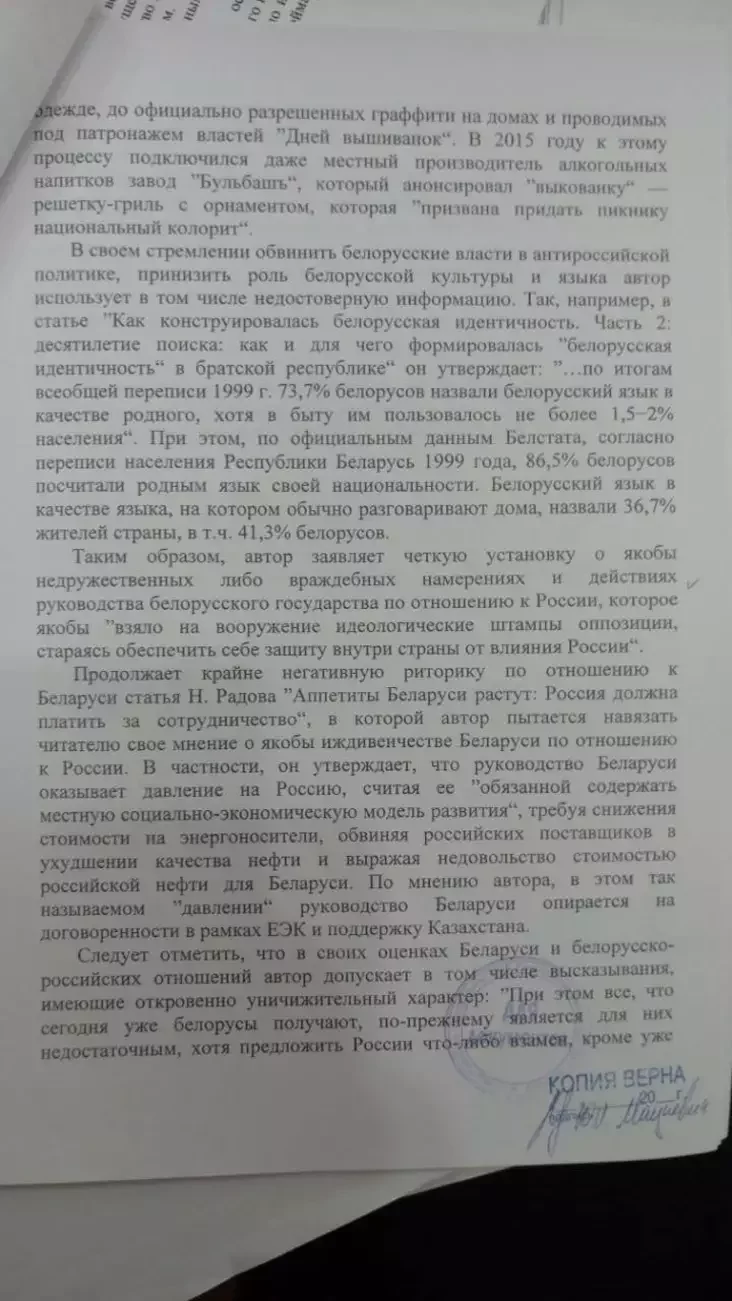 — Статьи могут вызывать у населения Российской Федерации чувство возмущения, негодования по отношению к властям Республики Беларусь и проводимой ими внешней политике, у белорусских граждан — неприязнь к лицам, проводящим информационную политику в России по отношению к Беларуси, что способно спровоцировать конфликтные ситуации на политической почве.