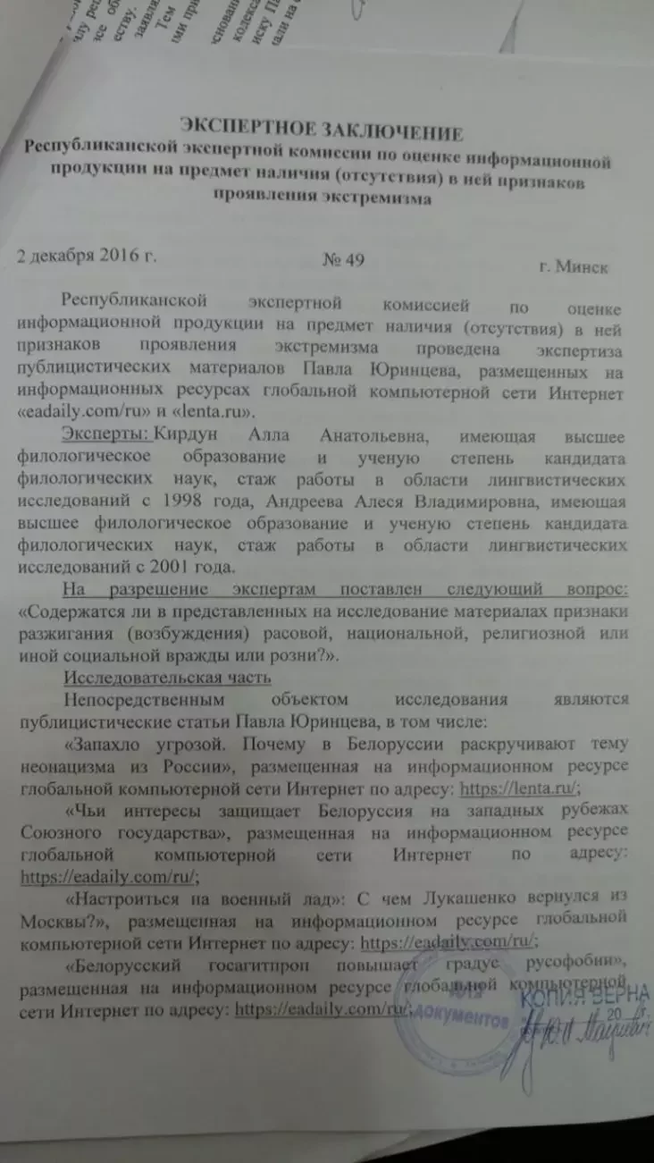 Тексты Павловца на сайтах Lenta.ru и EADaily под псевдонимом «Павел Юринцев» для Мининформа анализировали эксперты-филологи Анна Кирдун и Алеся Андреева. Экспертиза датирована 2 декабря 2016 года, то есть — за 4 дня до задержания Павловца.