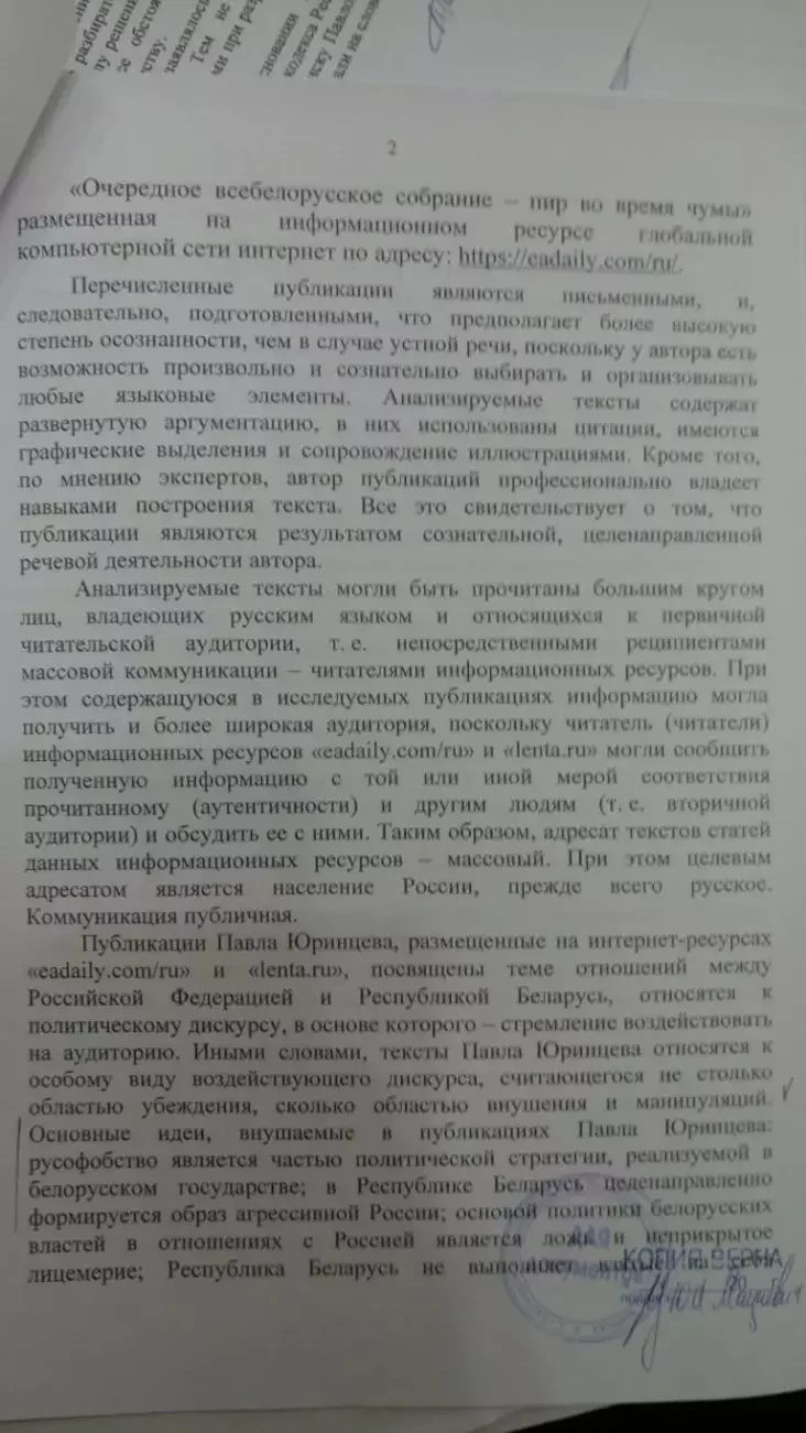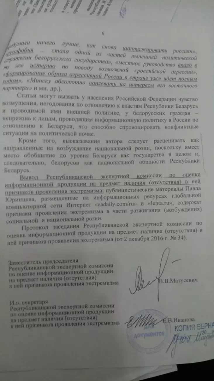Вчера Юрий Павловец, один из трех арестованных по делу «пророссийских публицистов» проиграл суд о защите чести и достоинства по иску к «Советской Белоруссии». Этот процесс оказался интересен еще и тем, что судья истребовал у следствия до сих пор закрытый документ — заключение комиссии по экстремизму при Мининформе, которое стало отправной точкой для уголовного дела. Через родственников Павловца оно попало к TUT.BY. Из документов становится понятно, чем руководствовались власти, начиная дело.
