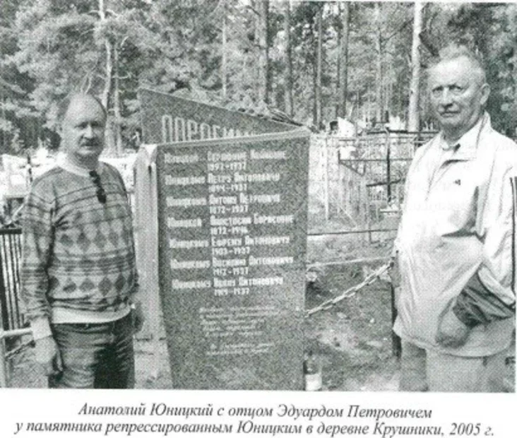 Юницкие живут в Крушниках с ХIХ века. Помещик Пётр Шумский привез трёх братьев Юницких из-под Варшавы к себе на Припять, они и основали будущие деревни: Крушники, Злодеевку и Зелёный Мох. Заезжие новые жители охотно брали в жёны местных красавиц, род разрастался. До 37го года. НКВД уничтожило большую часть рода Юницких. Отец Анатолия — Эдуард Петрович — собрал все данные о расстрелянных и пропавших без вести. Сама семья организовалась и установила памятный обелиск в память о Юницких, погибших от репрессий в те лихие годы. Отец вёл тайную тетрадь, где хранил данные обо всех, кто был расстрелян, включая родителей. Эта тетрадь потом перешла к Анатолию.