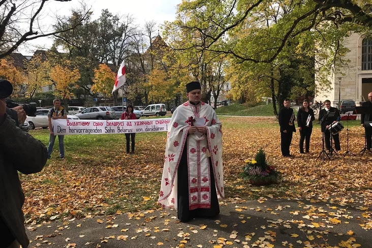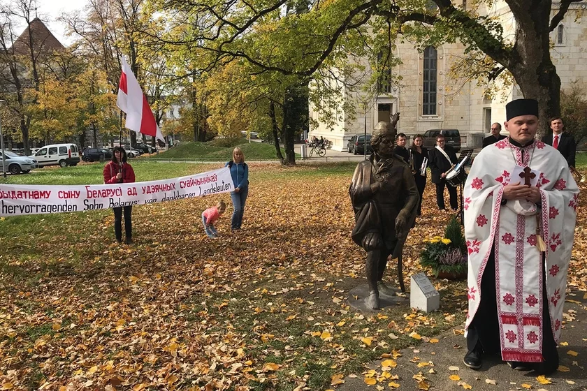Хотя на окончательной примирительной вывеске и нет надписи, что изначально была задумана [«Выдающемуся сыну Беларуси от благодарных соотечественников»], на торжестве по поводу открытия памятника она все же появилась.