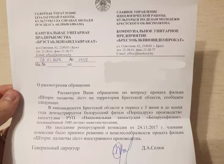 Дмитрий Селюк, директор «Брестоблкиновидеопроката», заявил «Нашей Ниве», что не будет комментировать эту ситуацию.