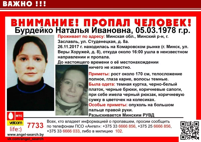 39-летняя Наталья Бурдейко проживает по улице Студенецкой в Заславле (Минский район). В воскресенье она отправилась на Комаровский рынок в столице, откуда ушла примерно в 16.00. После этого связь с ней оборвалась.