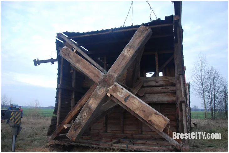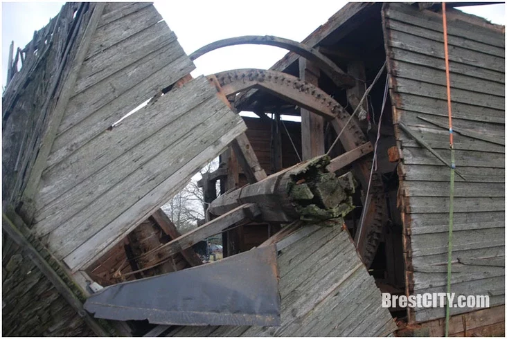 Позже выяснилось, что мельницу планировал перевезти в Дрогичин местный коллекционер. Нужно отдать должное, что перед предполагаемой транспортировкой, предварительно механизмы были закреплены тросами и были поставлены упоры.