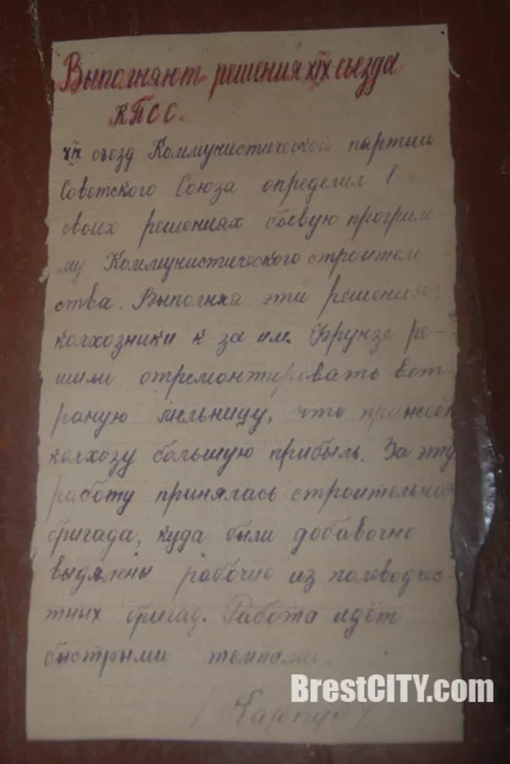 В 1939 году хозяина мельницы на пару месяцев призвали на войну. Мельнице требовался ремонт, денег не было, а потом началась Великая Отечественная война. После войны было не до мельницы. При коллективизации в 1950 году мельница перешла в собственность колхоза. В 1952 году на собрании работников колхоза имени Фрунзе председатель Карпук Иван Иванович предложил отремонтировать мельницу. Вот такой пожелтевший от времени листок нашли, когда ликвидировали местную библиотеку и разбирали бумаги.