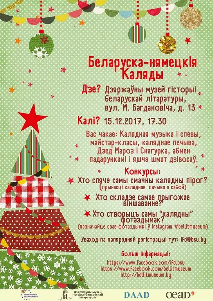 Музей Максіма Багдановіча прапаноўвае забіць двух зайцаў адразу: пазнаёміцца з традыцыямі і беларускага святкавання Калядак, і нямецкага. Акрамя традыцыйных хэнд-мэйд майстар-класаў, падчас якіх вас навучаць упрыгожваць пернікі і калядныя цацкі, абяцаюць батлейку і выступ ансамбля народнай песні «Гаманіна». Да імпрэзы трэба падрыхтаваць Дзеду Марозу верш і згатаваць што-небудзь салодкае — самым таленавітым і шчырым гасцям ён шчодра аддзячыць.