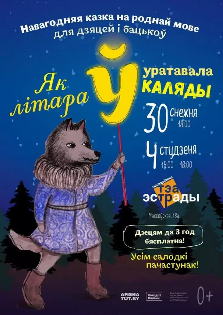 Літара Ў — адна з галоўных адметнасцяў, упрыгожанне беларускай мовы. Таму не дзіва, што ў гонар яе называюць кавярні, ставяць ёй помнікі і вось цяпер прысвячаюць казку, якую можна будзе паглядзець 30 снежня і 4 студзеня. Казка пра тое, як аднойчы літара ўратавала Каляды. Схадзіце дазнайцеся, як у яе гэта атрымалася, і пасля добра аддзячце за тое, што не згубілі гэтае цудоўнае свята продкаў.