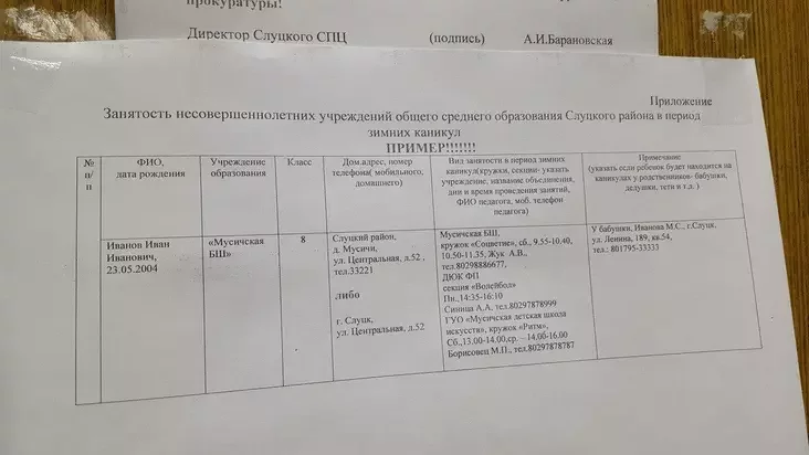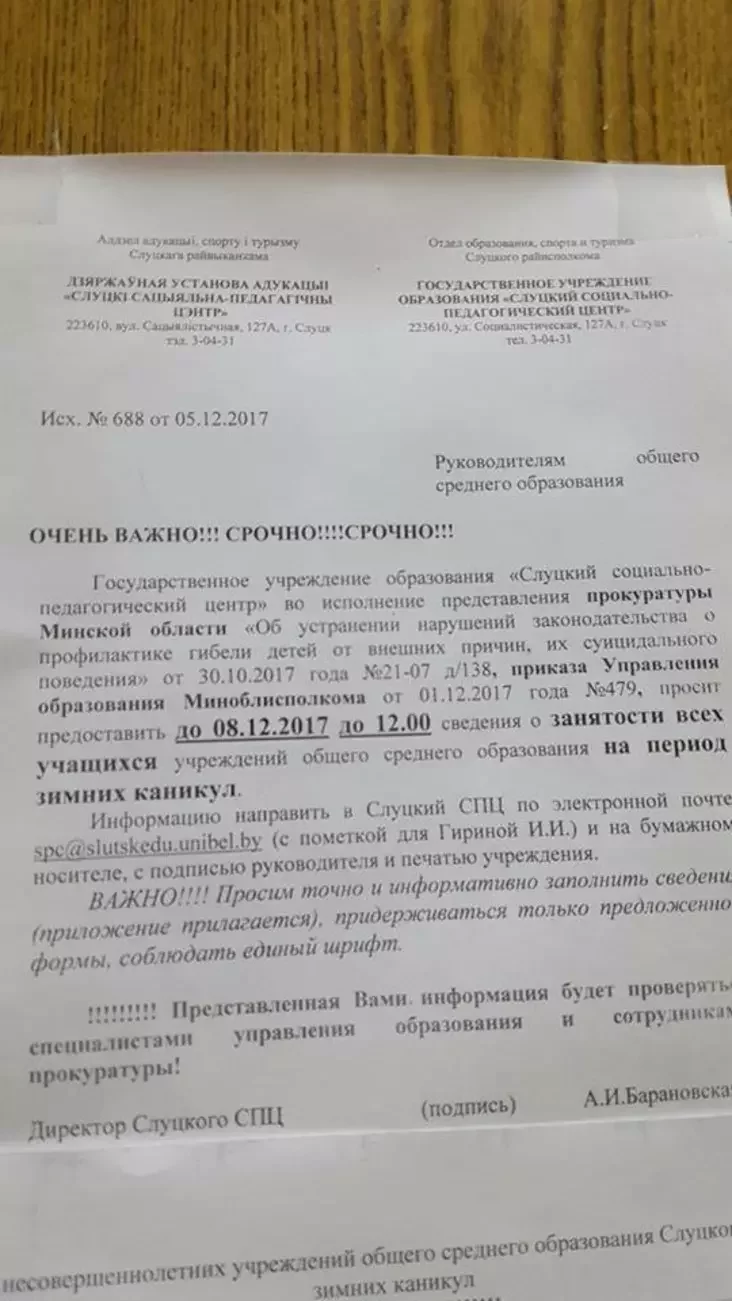 На этот раз Слуцкий социально-педагогический центр, пугая прокуратурой, заставляет педагогов к сегодняшней дате передать полную информацию о том, где будут находиться все ученики средних школ Случчины течение зимних каникул, которые начнутся только через три недели. Особо следует отметить требование «придерживаться единого шрифта».