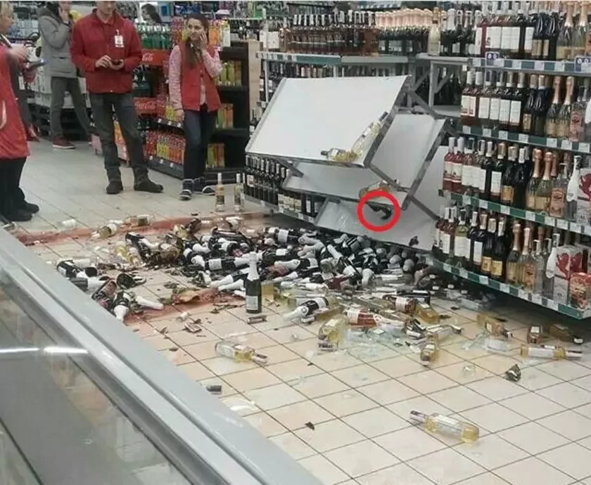 Первыми на это обратили внимание в телеграмм-канале фудхантеров «Мерзкий Кокобай». Посмотрите: одна из бутылок чудом удержалась на месте, оставшись стоять на полке.