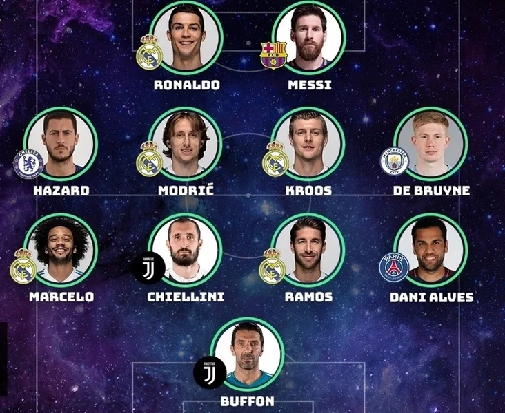 полузащитники — Кевин де Брейне («Манчестер Сити»), Тони Кроос, Лука Модрич (оба — «Реал»), Эден Азар («Челси»);