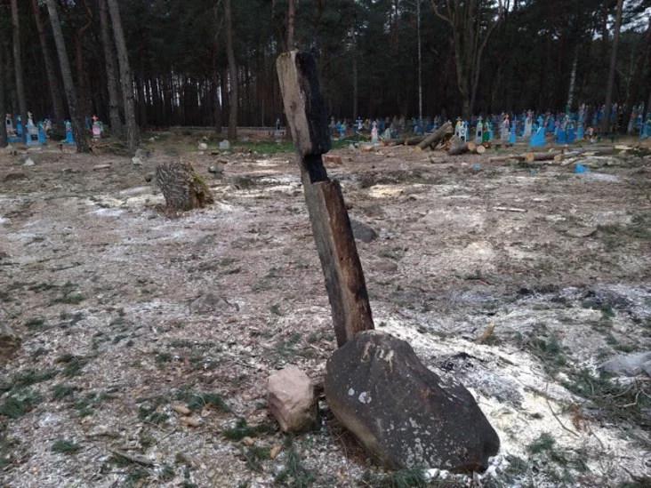 Багата якія камяні-надмагіллі былі перакуленыя і перасунутыя, драўляныя крыжы знішчаныя. А ў адным месцы тырчалі рэшткі абпаленага крыжа, каля якога гора-працаўнікі зладзілі немалое вогнішча.
