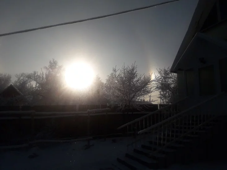 Ясная зимняя погода благоприятна для наблюдения за редкими природными явлениями — вот и сегодня в небе над Шабанами, на окраине Минска, можно было наблюдать гало вокруг солнца.
