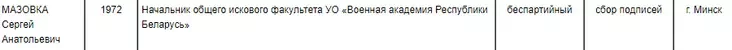В списке кандидатов можно увидеть забавную строку: Сергей Мазовка (баллотируется по Восточному округу №52), начальник общевойскового факультета Военной академии, указан как начальник «общего искового» факультета УО «Военная академия Республики Беларусь».