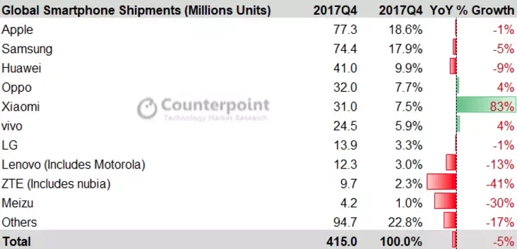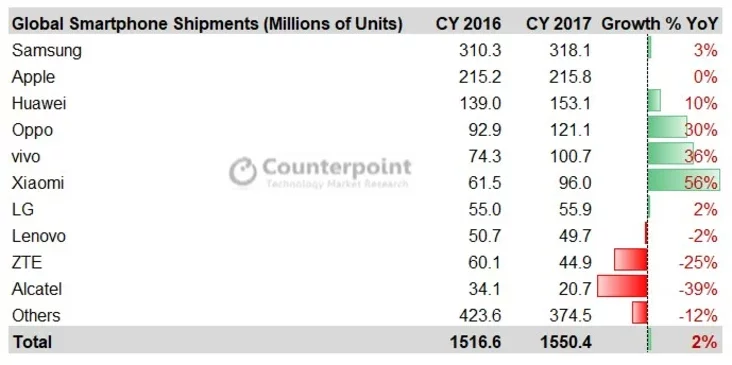 Компания Counterpoint провела исследование и назвала крупнейших мировых производителей смартфонов за четвертый квартал 2017 года и весь прошедший год, сообщает PhoneArena.