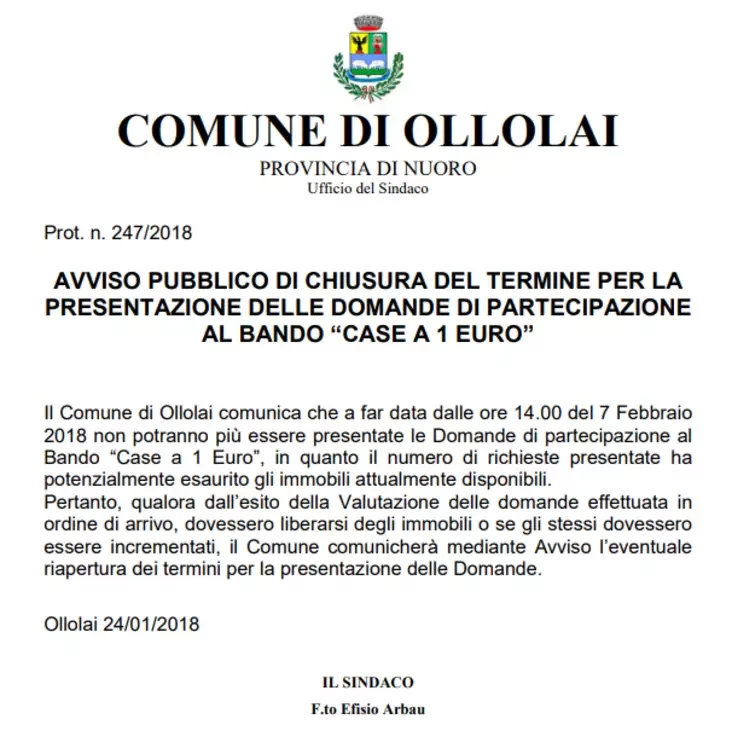 Пару дней назад мне предложили приобрести дом в Евросоюзе за 1 евро. Почему мне? Всем желающим! В итальянской провинции Сардиния муниципалитет Оллолаи (Ollolai) имеет более 200 пустых домов. Население городка сократилось в последние годы вдвое — с 2,5 до 1,2 тысячи человек.