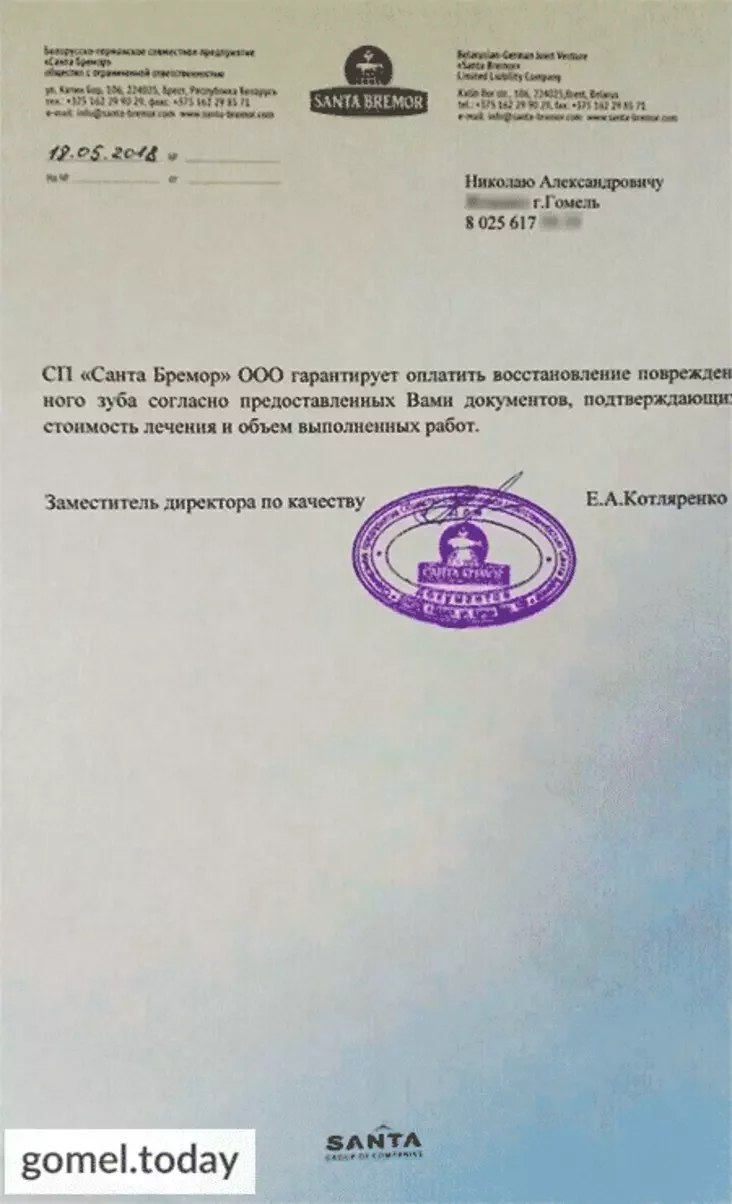 Мужчина утверждает, что оплачивать лечение всех зубов предприятие не собирается, указывая на то, что изначально им сообщили лишь об одном зубе и гарантийное письмо выписано на один.