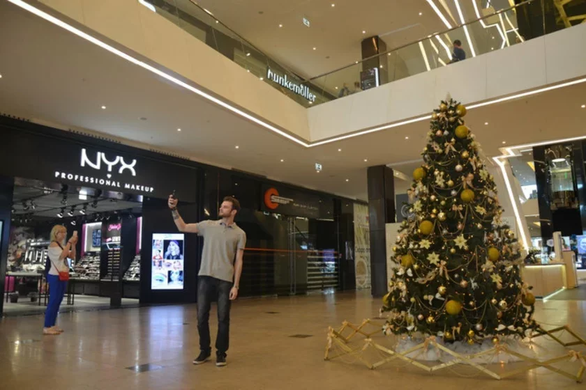 Елка в торговом центре появилась утром. Покупатели делают на фоне украшенной елки фотографии и шутят: «Либо забыли убрать, либо праздник круглый год».
