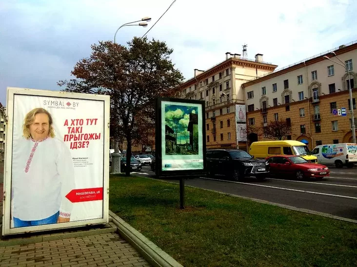 Рекламные ситибоксы с портретами Владимира Некляева и Юрия Жигамонта установили у станции метро Площадь Победы в Минске.