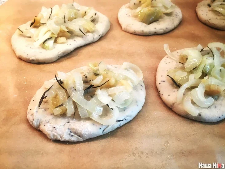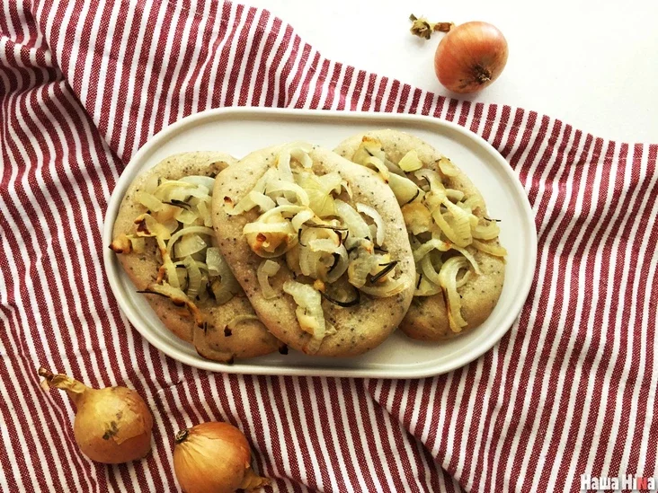 Меня заинтересовало сочетание репчатого лука с яблоком. Признаюсь, что до сих пор я скептически относилась к яблокам в несладких блюдах. Но здесь они добавляют сочность и вносят необычный привкус. А в сочетании с маком и розмарином это на первый взгляд простое блюдо оставляет весьма приятное впечатление. Блюдо идеально в качестве закуски или как дополнение к супу вместо хлеба. Приятного аппетита!