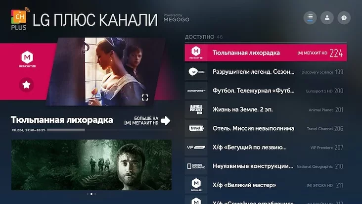 Чтобы воспользоваться сервисом, откройте на смарт-телевизоре LG приложение MEGOGO.