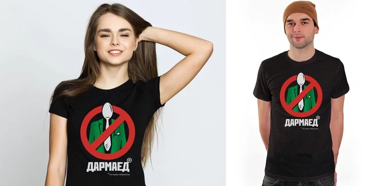 У аснове прынта — плакат Аляксандра Наважылава «Дармаед», намаляваны і выдадзены ў 1986-м годзе. Прайшло ўжо 32 гады, а тэма па-ранейшаму застаецца актуальнай.