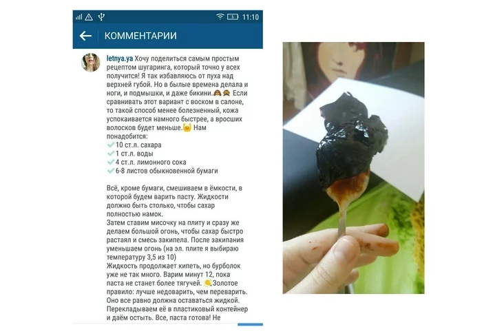 «Где-то в 2016-м году я вычитала в инстаграме одной эко-бьюти-блогерки домашний рецепт для эпиляции. Она обещала, что с этими ингредиентами процесс будет не такой болезненный, а волосков будет оставаться меньше.