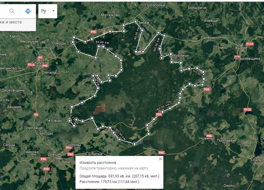 А вось я паспрабаваў накрэсліць межы Пушчы. Калі паўночную і заходнюю мяжу вызначыць лёгка — там, дзе заканчваецца лес, то з усходняй і паўднёвай мяжой была праблема. На поўдні Пушча мяжуе з лясамі Бярэзінскага запаведніка і я накрэсліў мяжу па дарозе Р29. На ўсходзе абмежаваўся дарогай Зябкі — Ушачы. Але можа, мае сэнс шырэй глядзець на паняцце Галубіцкая Пушча — і тады можа выйсці плошча не 700, а 1.000 і болей квадратных кіламетраў.