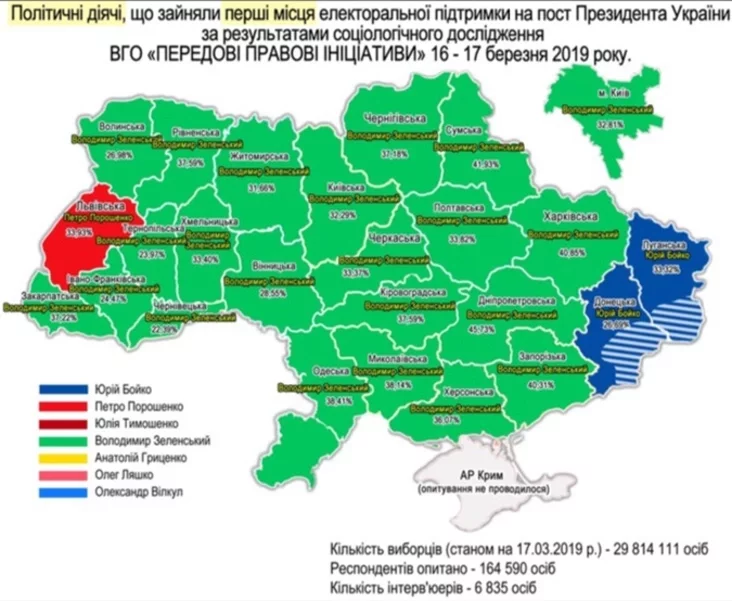Следует отметить, однако, что «Передовые правовые инициативы» могут быть связаны с миллиардером Игорем Коломойским, который поддерживает Зеленского. А потому их цифры не обязательно корректны. Большинство опросов на сегодня дают Зеленский 24—27% голосов, а Порошенко и Тимошенко - от 15 до 18%.