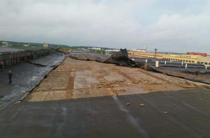 Вечером 29 мая в Минске бушевал ураган: затопило дороги и даже сорвало крышу храма. На территории тракторного завода, как оказалось, стихия натворила немало дел. Повреждены сотни квадратных метров кровли и остекления.