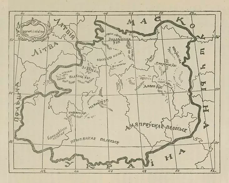 Границы белорусских земель на карте соответствуют границам на схематических картах книги Смолича и отличаются как от границ карты БНР 1918—1919 гг., так и от границ карты Евфимия Карского 1903 года. Названия государств и городов в учебнике и на карте поданы практически одинаково.