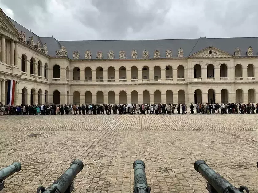Гроб с телом Жака Ширака, накрытый французским триколором, выставлен во дворе Дома Инвалидов, у собора Святого Людовика. На церемонию прощания могут прийти все желающие. Она началась в 14:00 по местному времени, но еще за несколько часов до ее начала у Дома Инвалидов выстроилась внушительная очередь.