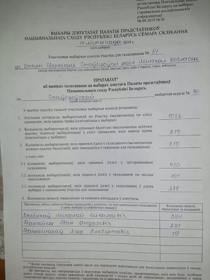 Николай Лысёнков официально победил в деревне Старый Свержень. Там за него отдали голоса 394 человека, а за Мамайко — 291. Побеждает Лысёнков и во время голосования в основной день по Столбцам, особенно по тем округам, где было наблюдение, но в целом победит Иван Мамайко.