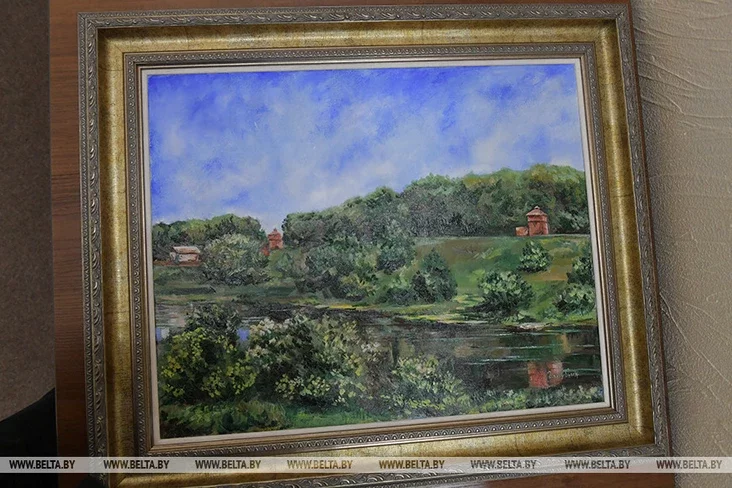 Картина написана студенткой шестого курса педиатрического факультета БГМУ Юлией Голубчик. Она изобразила окрестности малой родины президента. Девушка пояснила, что ее детство прошло в Быхове, а это тоже на Могилевщине.