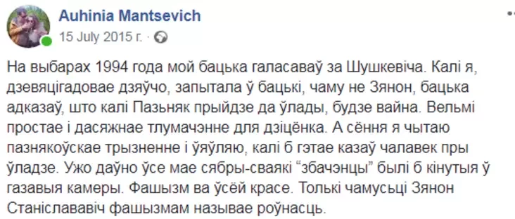 Журналистка Авгиния Манцевич почти 5 лет назад передала свои детские впечатления, как ее отец, заслуженный деятель белорусского движения, признался, что не голосовал за Пазняка, поскольку у него тот ассоциируется с войной. (Дальнейшие рассуждения, которые связывают Пазняка с фашизмом, как по мне, совершенно гипотетические; во всяком случае, к предмету нашего анализа отношения не имеют.)