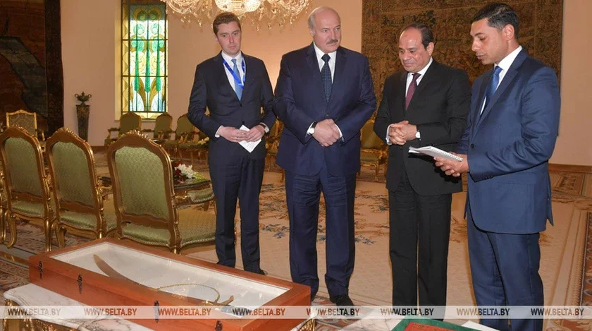 Президент Египта Абдель Фаттах ас-Сиси во время переговоров с Лукашенко сделал ему подарок — египетский меч, передает БелТА.